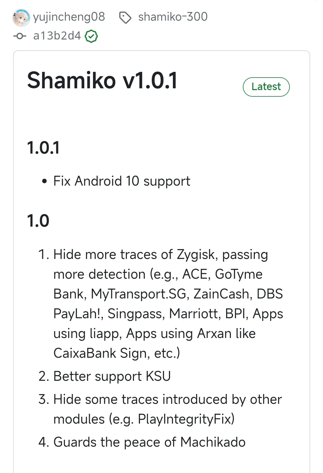 持续优化:不断更新以支持更多应用和系统版本,如 v1.0.1 版本大幅提升了隐藏能力,支持更多检测环境。