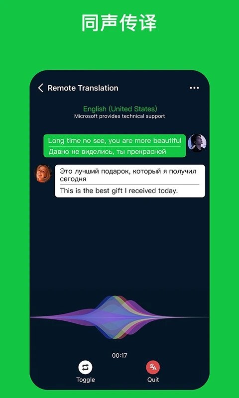 3、实时翻译功能,自动将发送的文字进行实时翻译,确保身处两国的双方,语言不会成障碍。