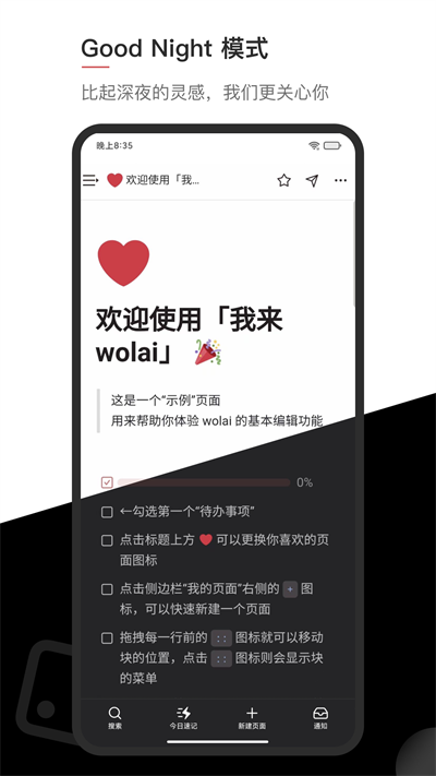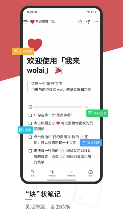 wolai是一款可以用于记录、整理、检索等方面的软件,文字、图片、待办事项等文档都可以保存在软件中,构建一个只属于你的手机信息库,也可以选择将文件的协作连接发送给同事,邀请他们一起编辑文档。笔记数据即时上传备份到云服务器中,即使手机没电关机、摔坏都不用担心笔记丢失。