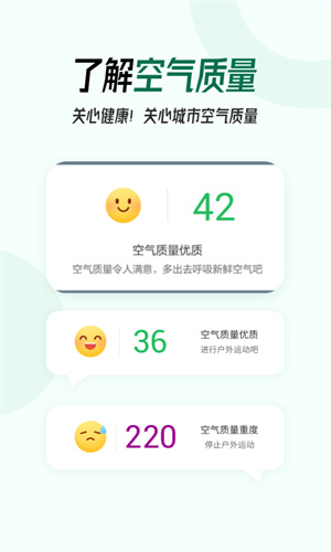 3、空气质量预报,提供分时段的空气质量,了解空气污染、PM2.5指数、AQI指数等信息。