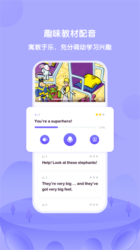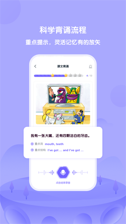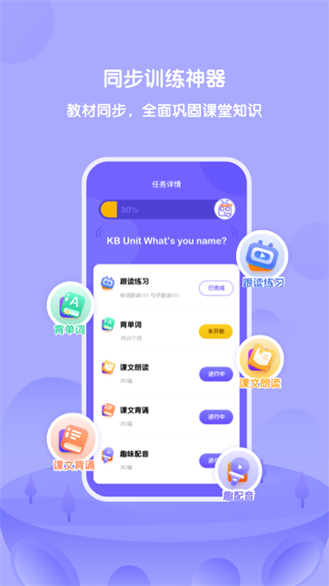 教材同步课文听读跟读,提供单词级的即时反馈,细化训练颗粒度。