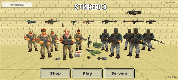 1:进入游戏主界面,可选择“Shop(商店)”“Play(开始游戏)”“Servers(服务器)”功能,界面展示了丰富的武器、角色和道具资源。
