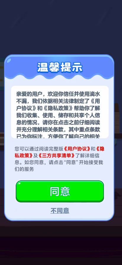 1、进入游戏会有各种权限使用说明,点击同意即可